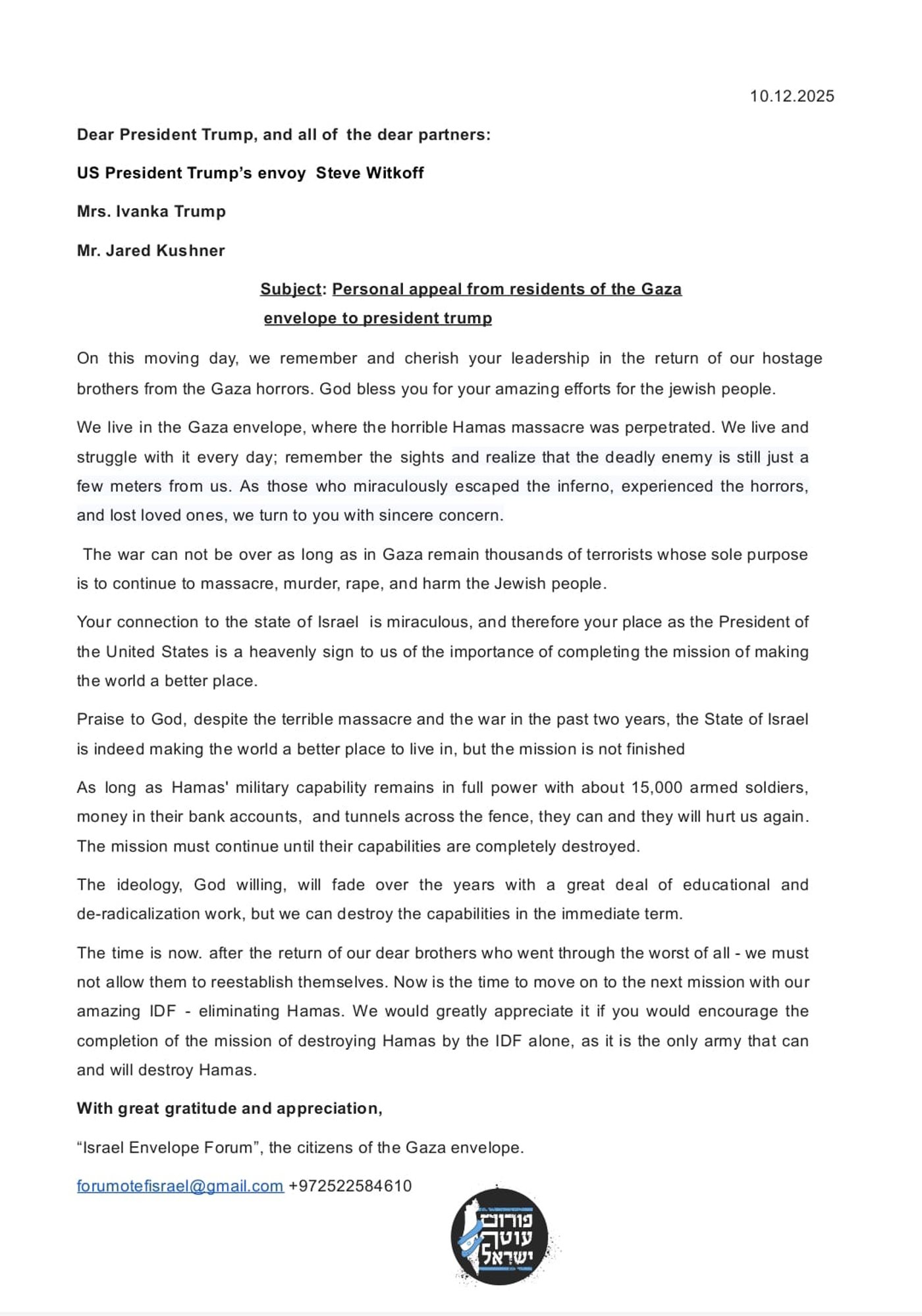 הפורום שמאגד אלפי תושבים הגרים בשדרות, ביישובים ובקיבוצים בנגב המערבי, מסר לפני זמן קצר (שני) מכתב אישי לנשיא טראמפ ופמלייתו דרך פורום הגבורה, על מנת להודות לו על העשייה למען עם ישראל ולהדגיש בפניו כי המלחמה תסתיים רק לאחר שחמאס יוכרע צבאית ושלטונית ולא יהווה יותר איום על תושבי העוטף וכל תושבי ישראל.